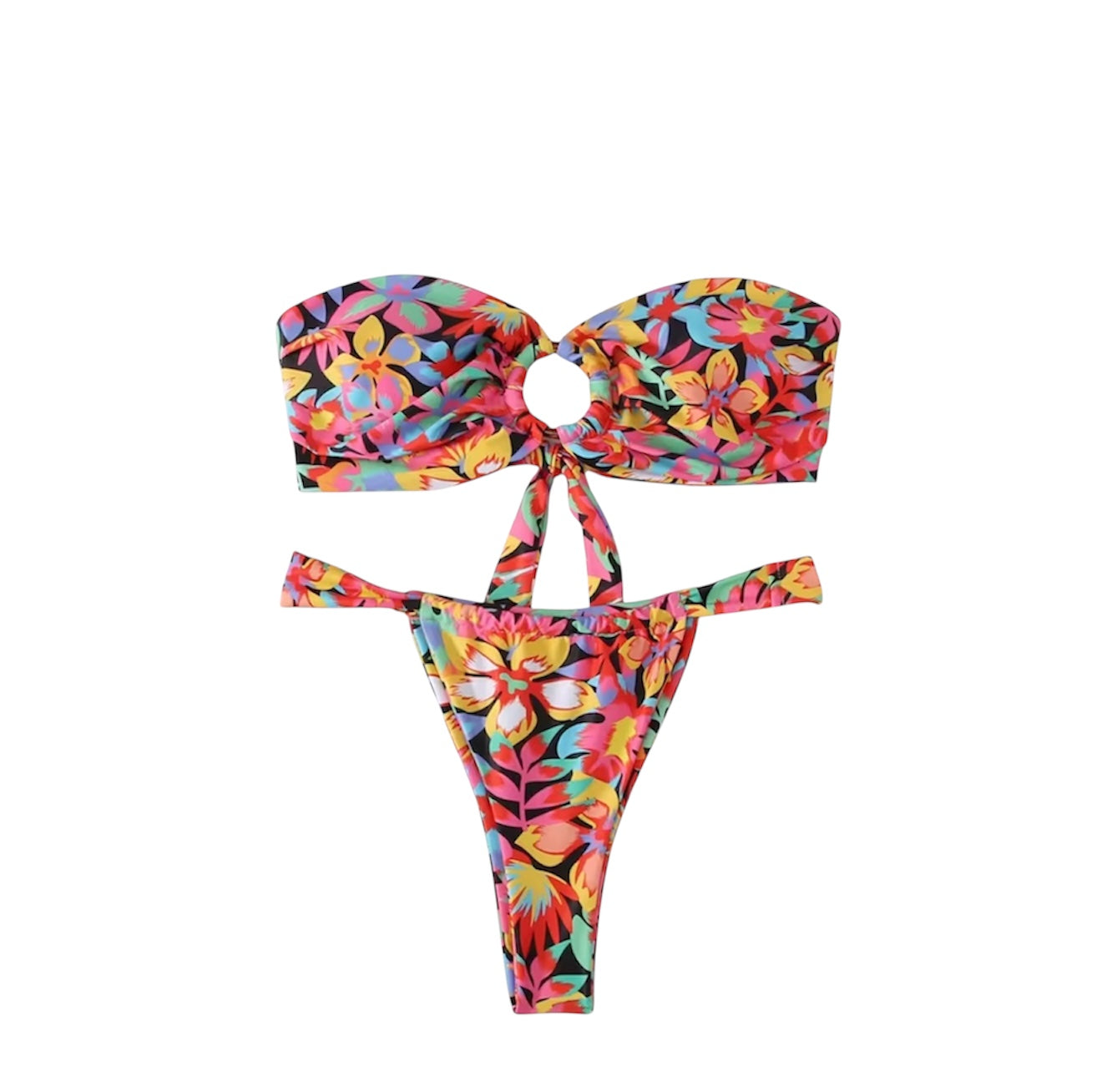 Turn heads in our Fauna Swimwear — a vibrant strapless bikini with a floral print, center ring detail, and flirty cut-outs that channel tropical energy. Perfect for poolside lounging or your next island escape.