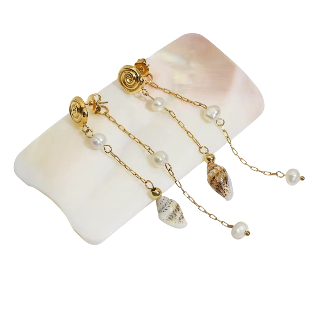 Waterproof and beach-ready, these earrings feature real seashells, pearls, and gold-tone chains—perfect for sunny days and ocean vibes.